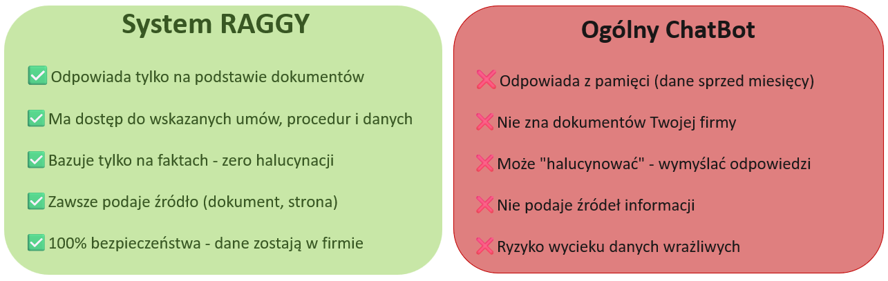 RAGGY nie "zgaduje", nie tworzy treści spoza udostępnionych materiałów i zawsze opiera się na aktualnych danych organizacji. To sprawia, że RAGGY jest bezpieczną formą wykorzystania AI w firmie. Dzięki RAGGY, pracownicy firmy: