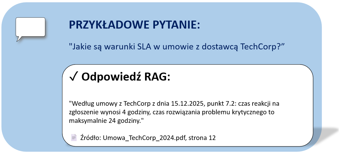 To połączenie technologii AI z firmową dokumentacją: umowami, procedurami, regulaminami i wiedzą operacyjną. System łączy wyszukiwanie informacji w dokumentach firmowych z generowaniem odpowiedzi, która wykorzystuje wyłącznie znalezione fakty.