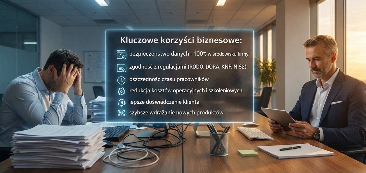 Zamiast przeszukiwać foldery, procedury i pliki PDF — pracownik po prostu pyta, a system generuje odpowiedź wraz ze wskazaniem dokumentu źródłowego.